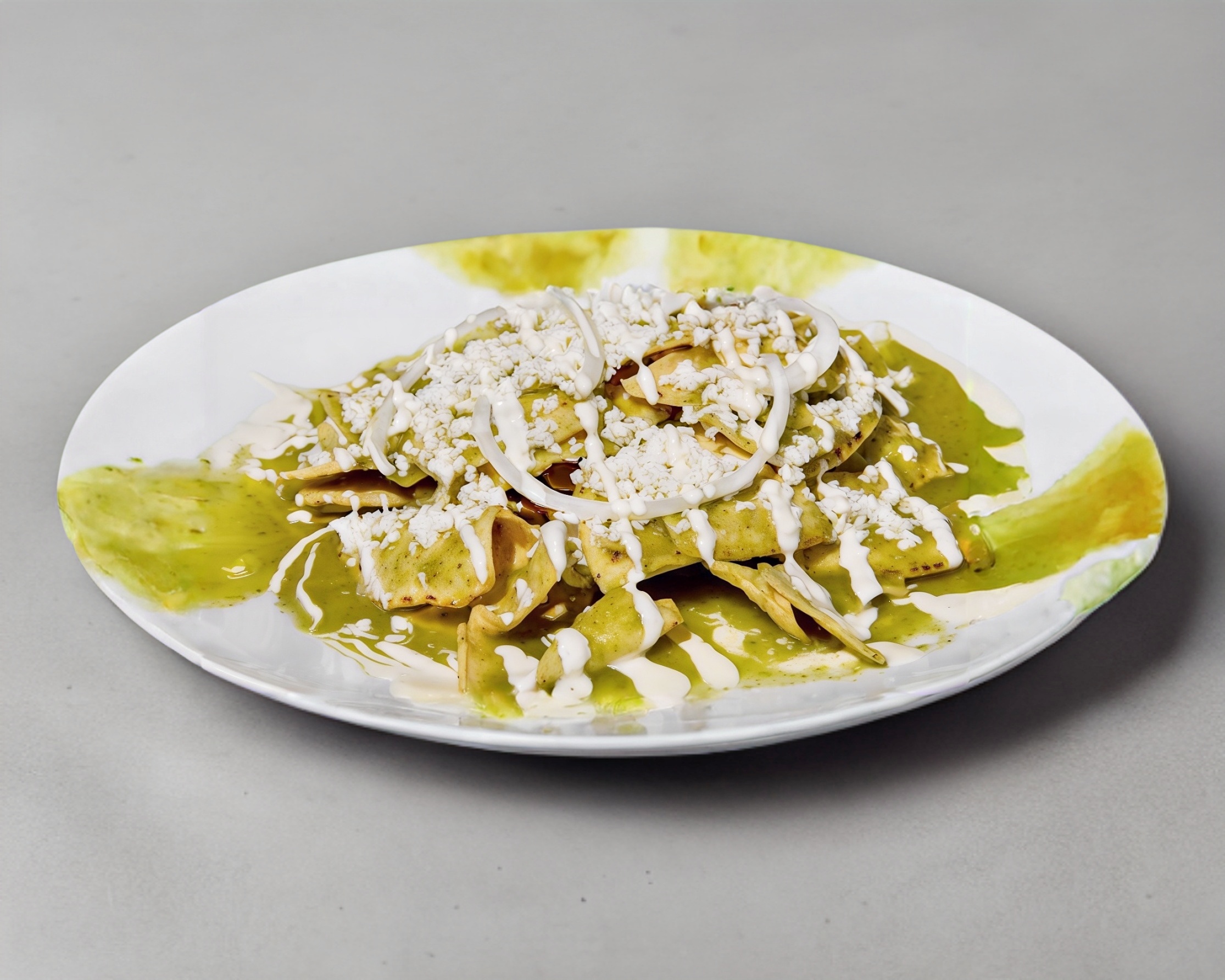 Deliciosos chilaquiles en salsa verde servidos con su crema y queso asadero, acompañados de frijoles refritos y lechuga.
