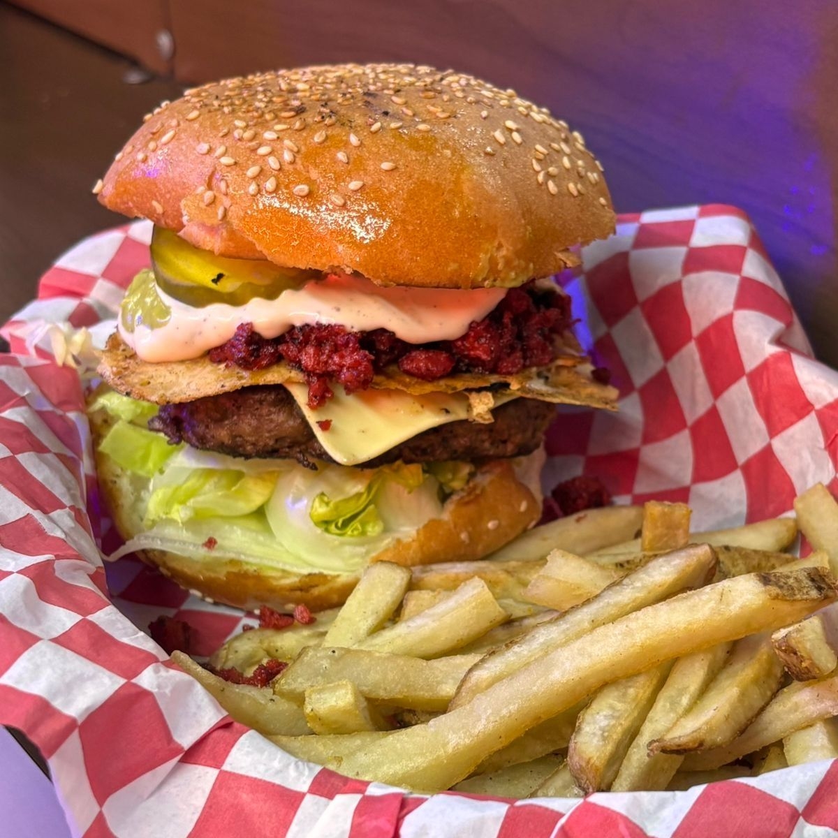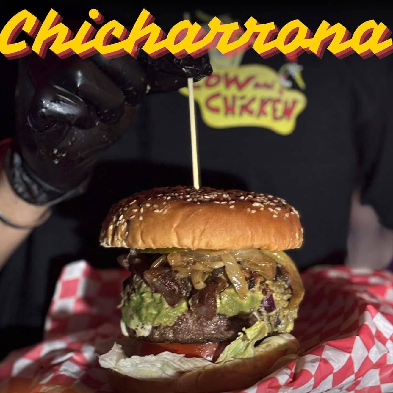 Pan parrillero relleno con 170g de jugosa carnita de res, crujiente chicharroncito de la Ramos, guacamole cremoso, vegetales frescos y nuestro aderezo especial de la casa.