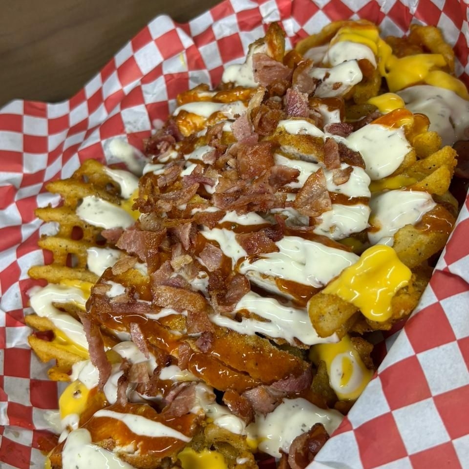 Fajitas de pollo empanizado sobre una cama de papas crisscut bañadas en queso amarillo, salsa a tu elección, tocino picadito y aderezo de la casa.