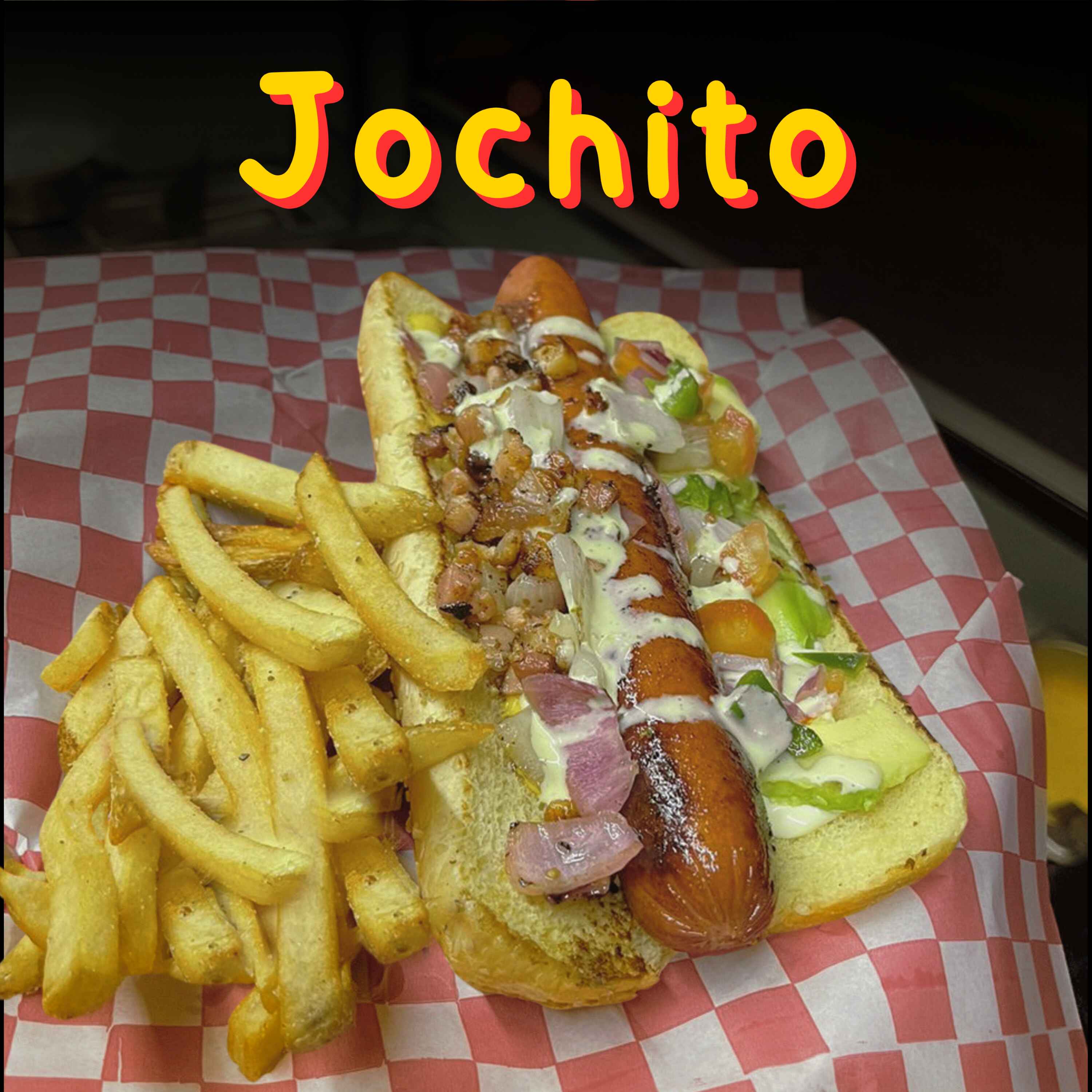 Salchicha de 22 cm servida con mayonesa, mostaza, guacamole, cebolla asada, aderezo de la casa y tocinito picado acompañado de papas a la francesa.