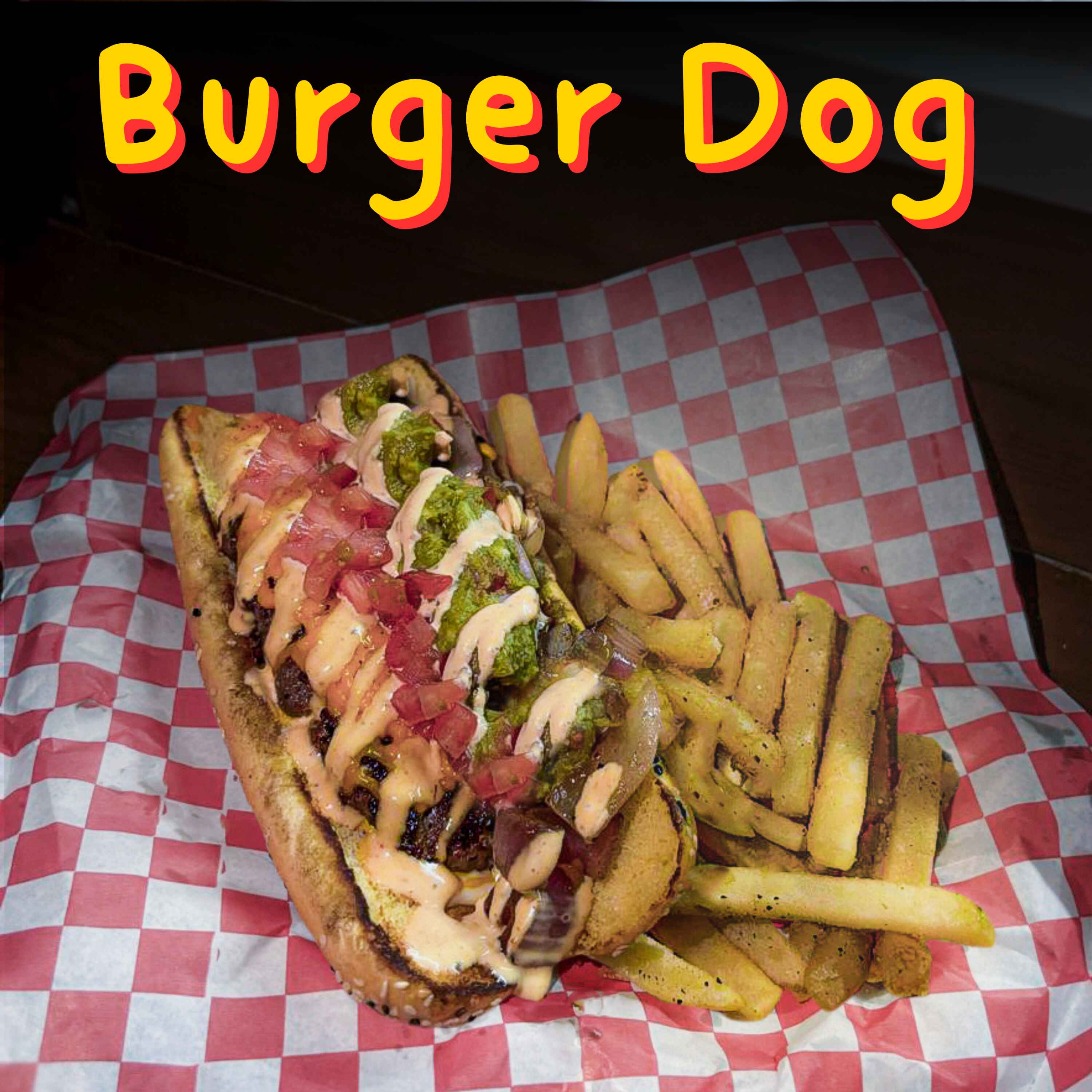 180g de Carne de res en forma de salchicha servida en pan, con mayonesa, mostaza, guacamole, cebolla asada, tomate y cebolla fresca, además del aderezo de la casa, acompañado de papas a la francesa.