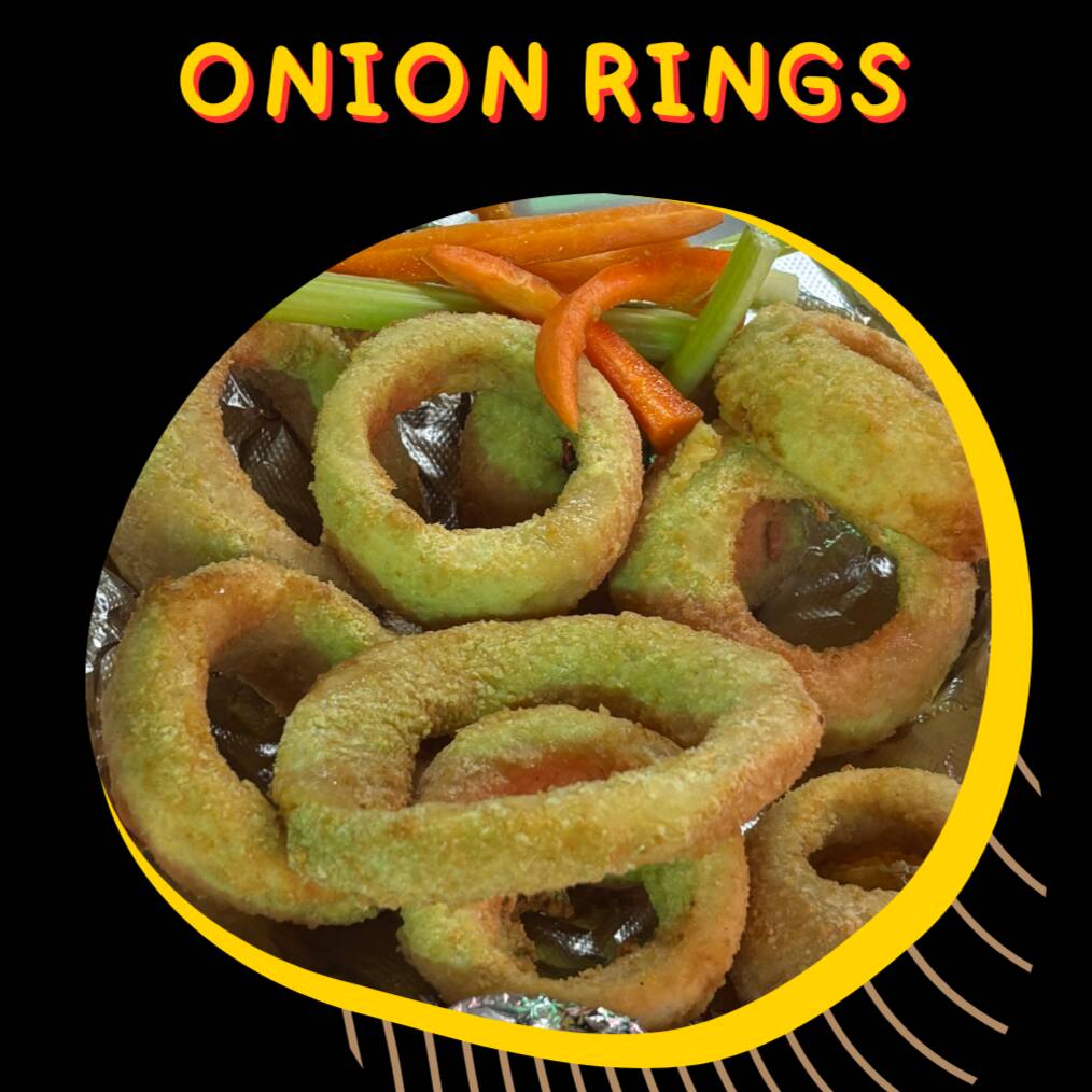Crujientes aros de cebolla empanizados fritos. Incluye aderezo especial de la casa aparte para acompañar.
