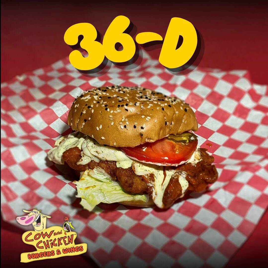 Pan parrillero relleno con 180g de crujiente pollo empanizado, bañado en deliciosa salsa, acompañado de lechuga y tomate fresco, cebolla, queso derretido, aguacate cremoso, mayonesa y mostaza
