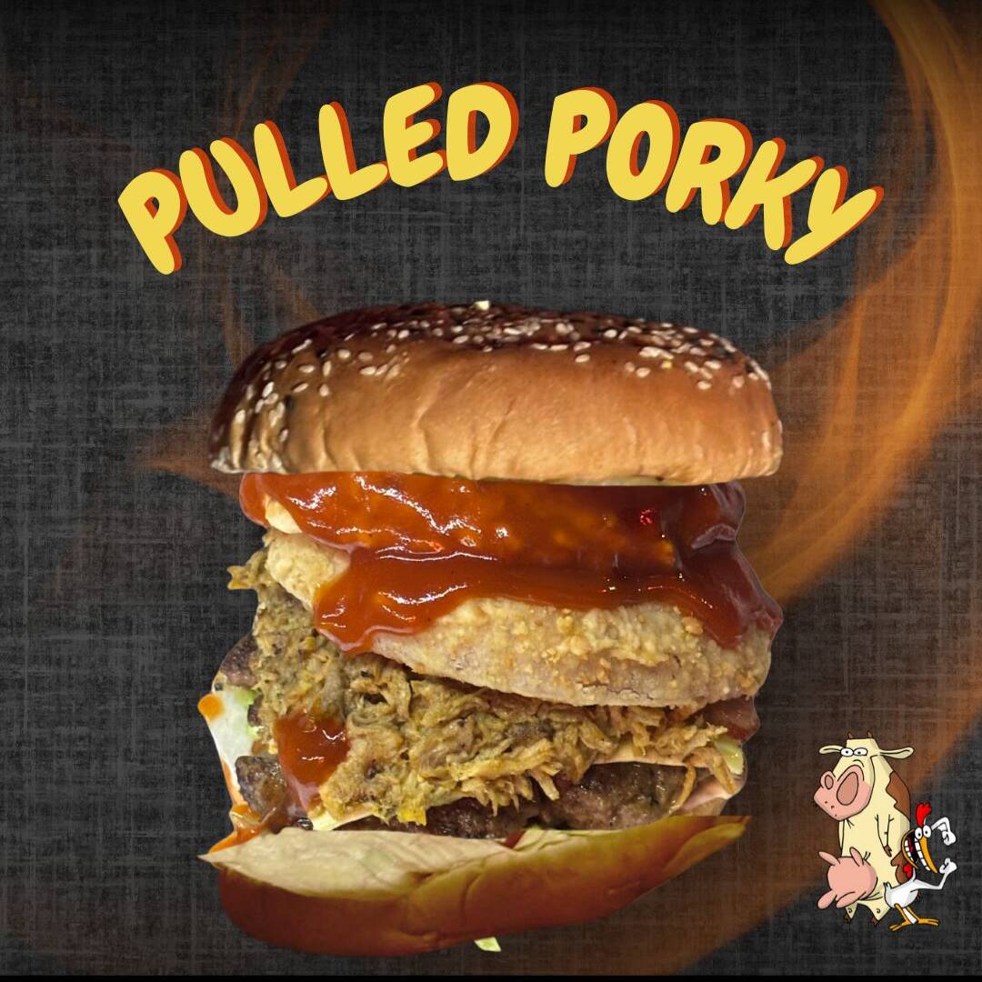 Pan parrillero relleno con 170g de carnita de res y delicioso pulled pork, acompañado de lechuga fresca, tomate, aros de cebolla crujientes, tocino doradito, bañados con salsa BBQ y nuestro aderezo especial de la casa.