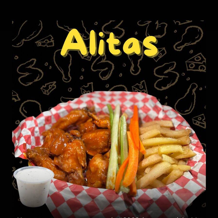 1kg de Alitas bañadas en la salsa de tu gusto, acompañadas de crujientes papas a la francesa, zanahoria y apio frescos.