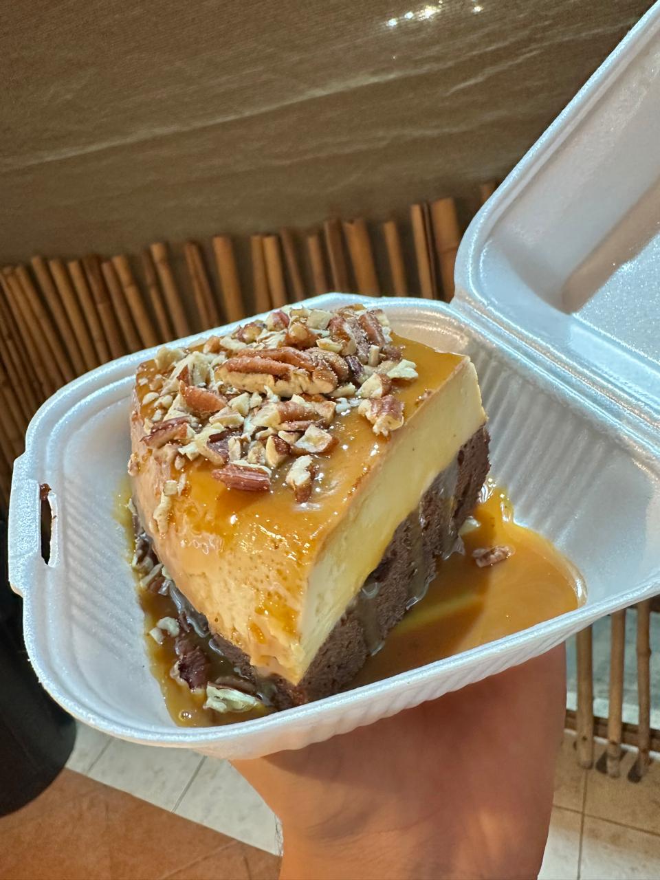 Rebanada de chocoflan delicioso con caramelo líquido arriba y nuez porción aprox 380gr.