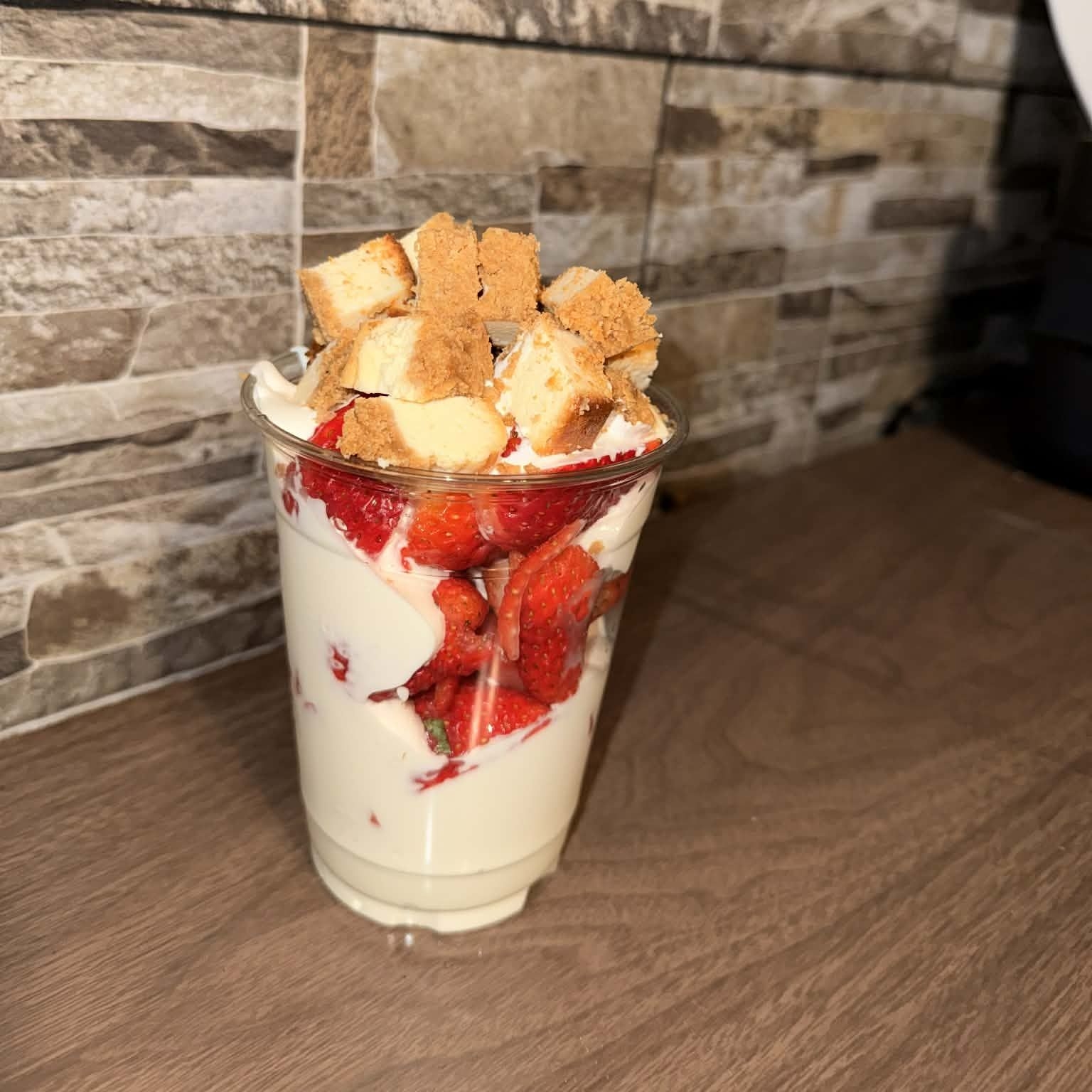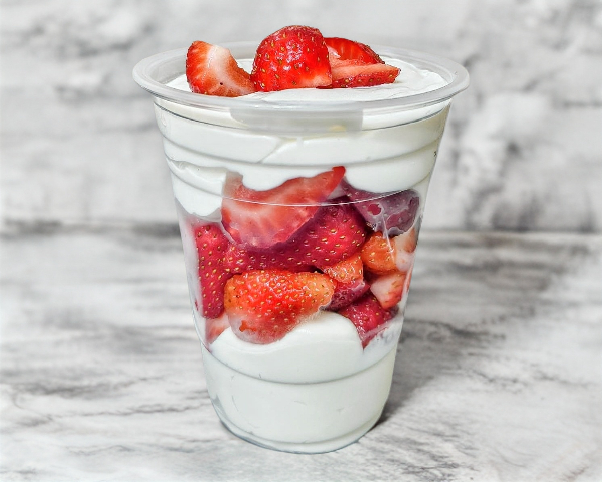 Fresas con crema casera, vaso 16onz