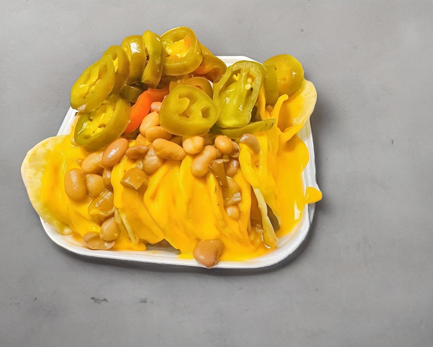 Levan queso amarillo calientito, frijoles y jalapeños en rodajas.
