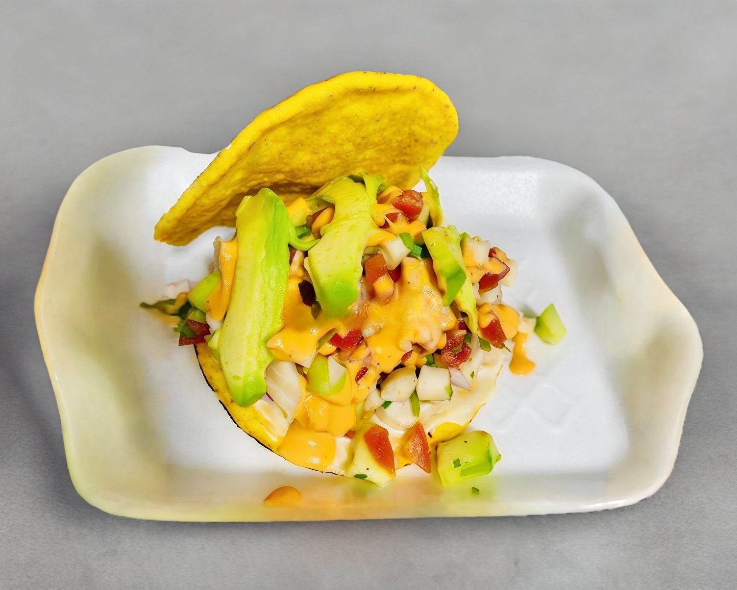 Tostitos Verdes con Ceviche de Pescado, incluyen: Aguacate, chipotle y salsa.