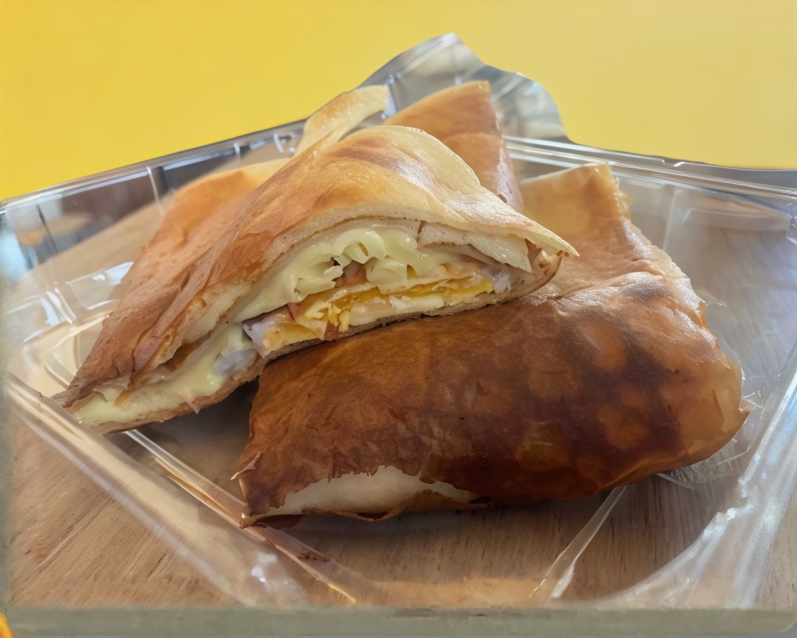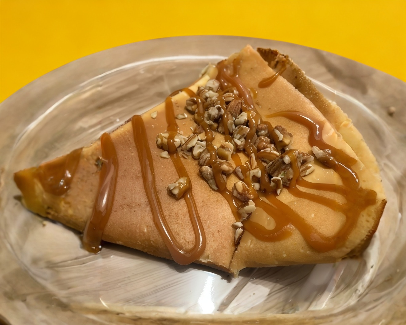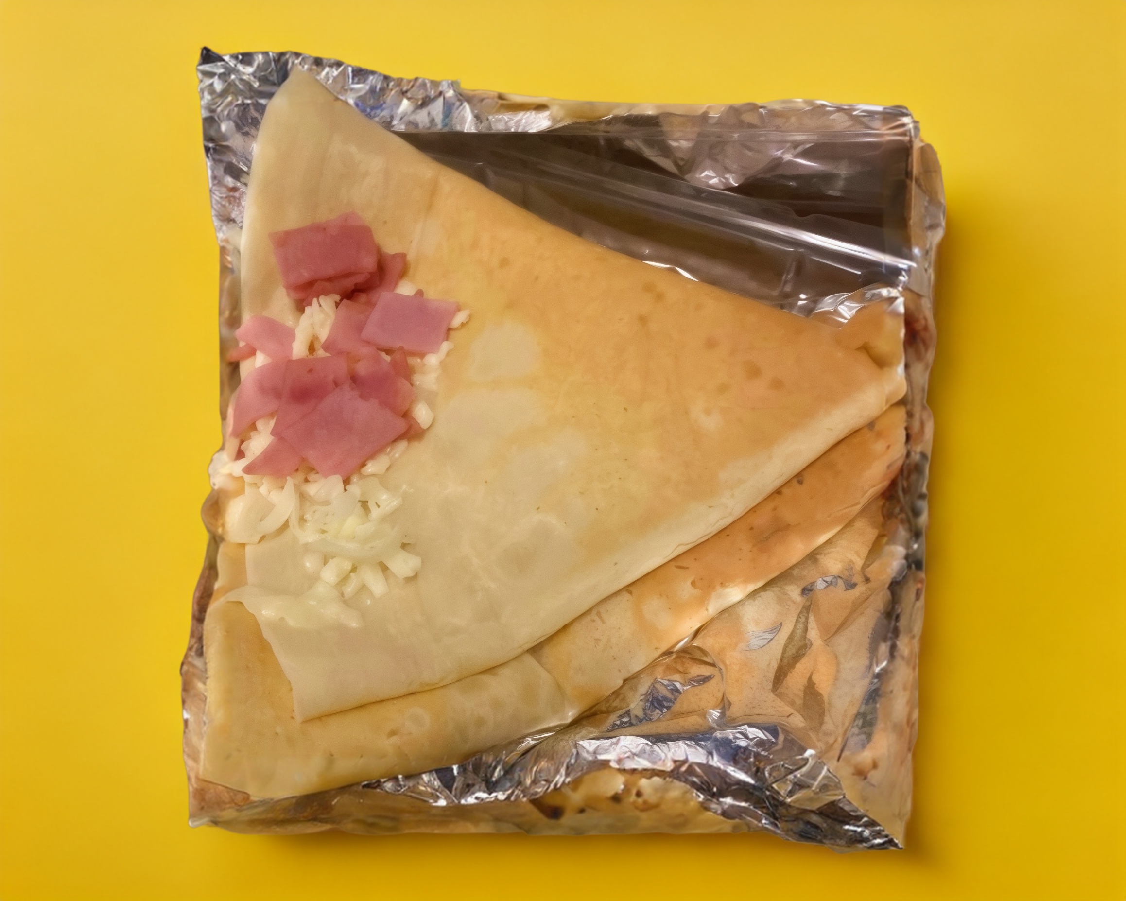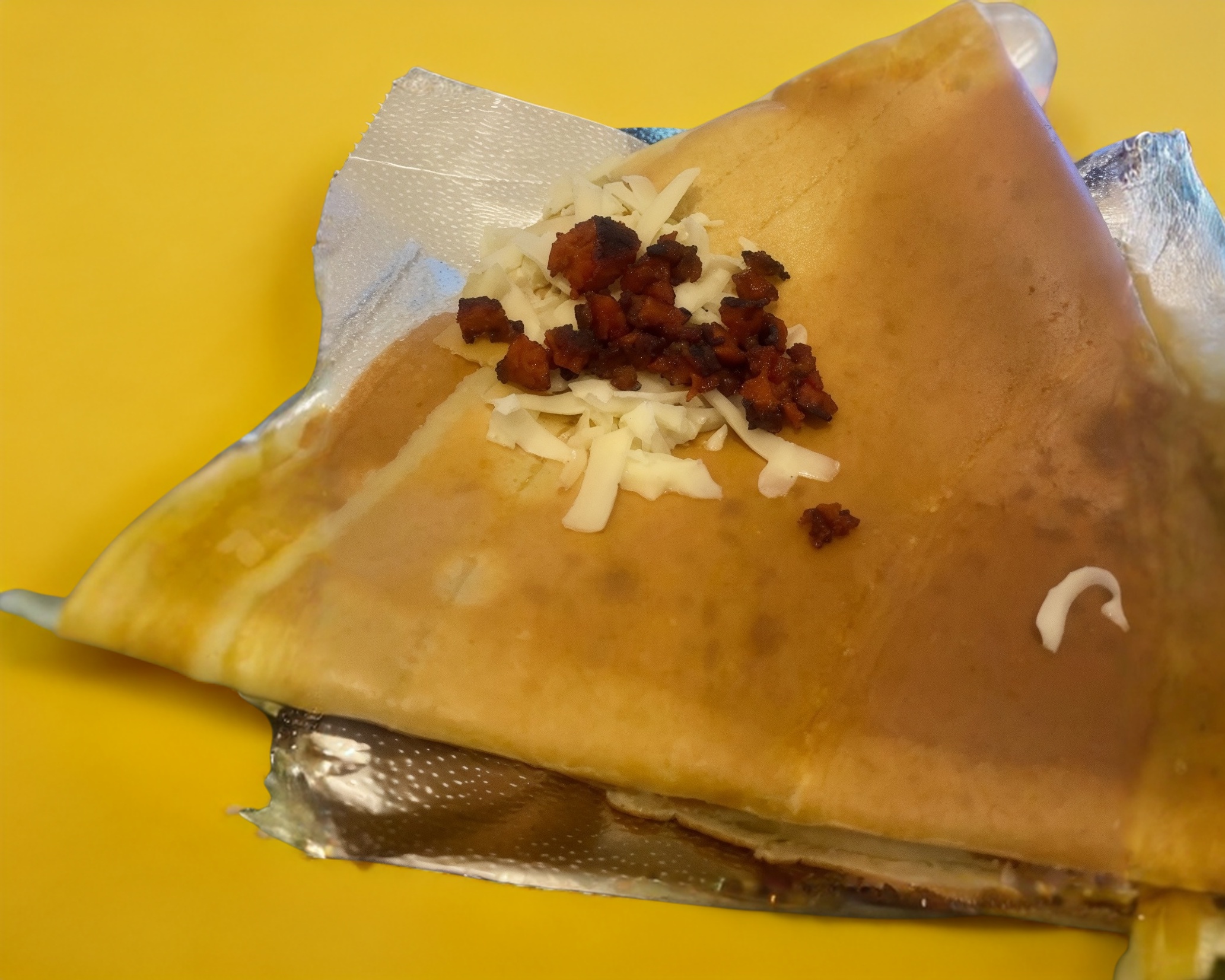Crepa con crujiente tocino, queso gratinado y huevo estrellado.