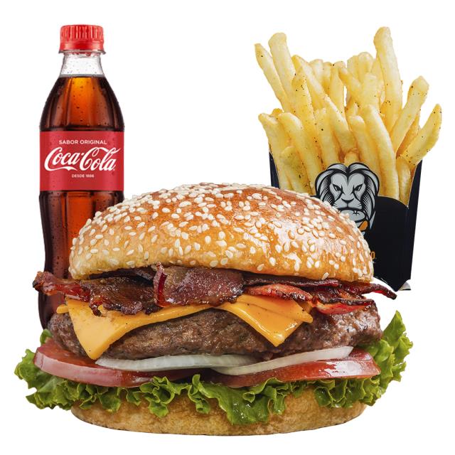 Hamburguesa con Tocino y 250 g de carne de res. Acompañada de papas a la francesa (120 g) y refresco de la familia Coca Cola a elegir de 400 ml.