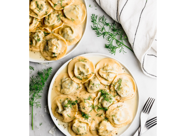 Pasta en forma de triangulo rellena de 5 quesos con la salsa de tu preferencia
