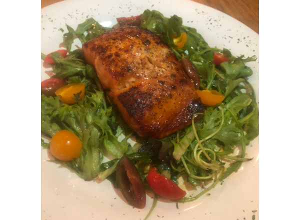 220gr de salmon marinado con salsa a base de jugo de naranja, sobre una cama de ensalada de lechugas y tomates cherries