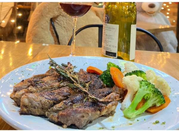 250gr de filete de res en salsa cuore (vinagre balsamico y vino tinto) acompañado de 50gr de spaghetti aglio olio y ensalada