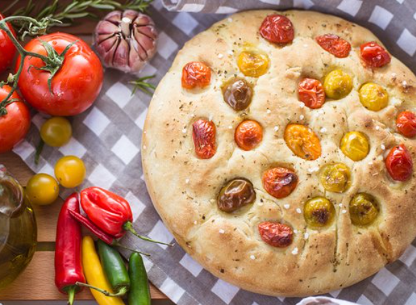 Masa esponjosa, ataviada con hierbas aromaticas, aceite de oliva y topping de tomates cherrys