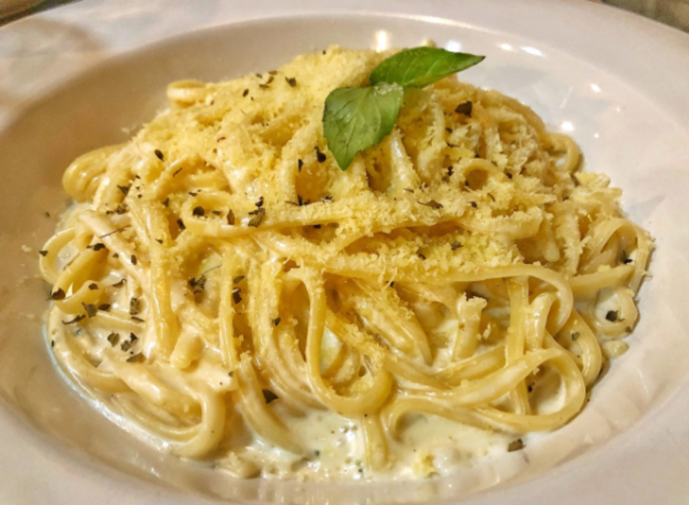 Base de pasta fetuccine al dente bañado en salsa alfredo de la casa extra-cremosa