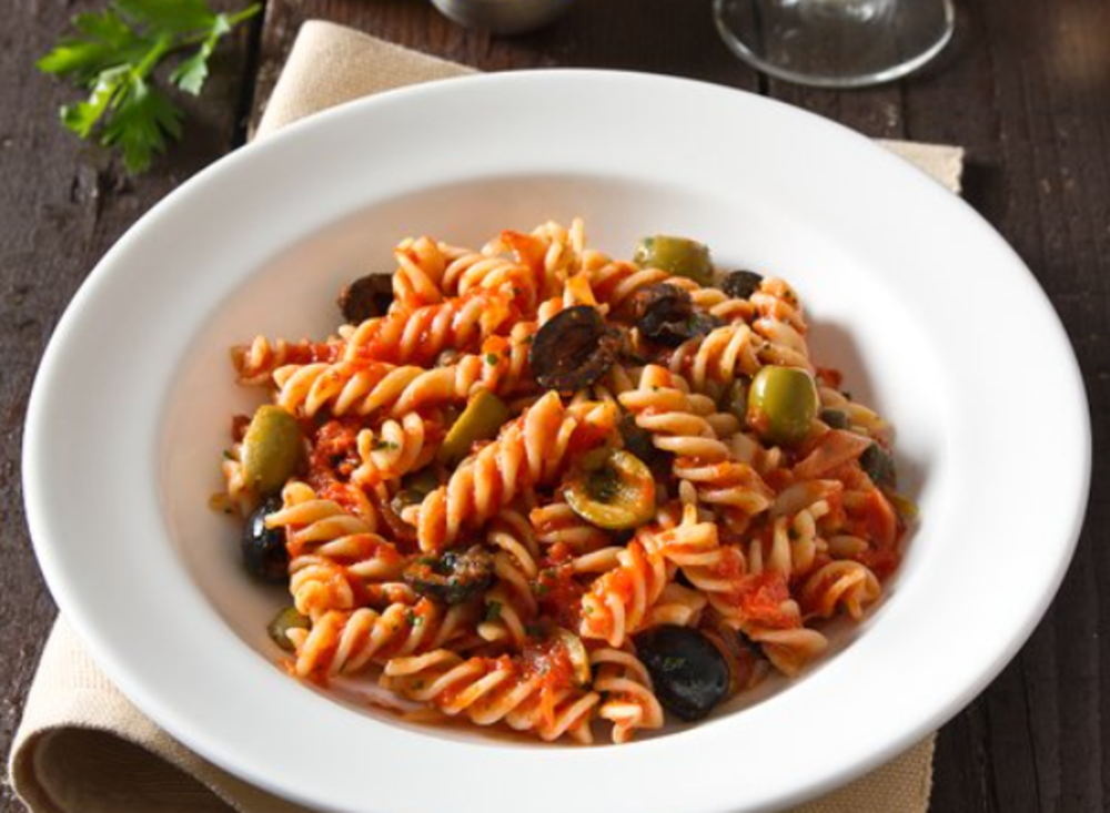 Base pomodoro de la casa con mix de aceitunas kalamatas, verdes y anchoas