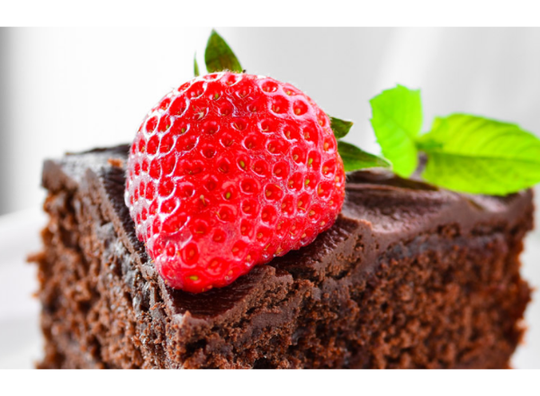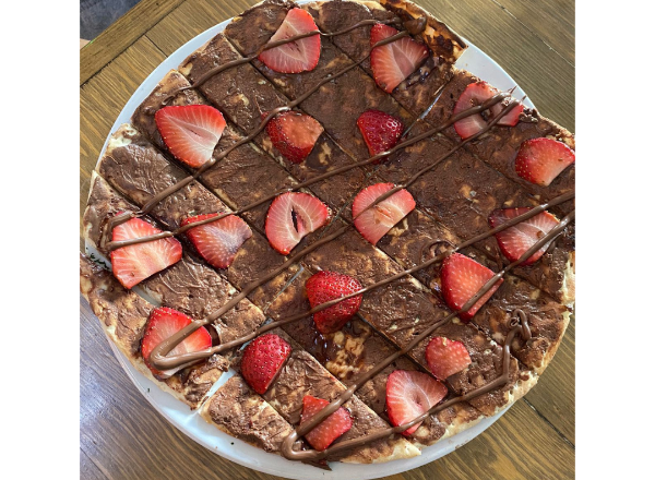 Focaccia dulce, bañada con nutella y topping de fresas rebanadas