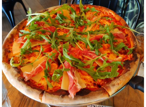 Prosciutto, parmesano rallado, arugula, tomates cherries