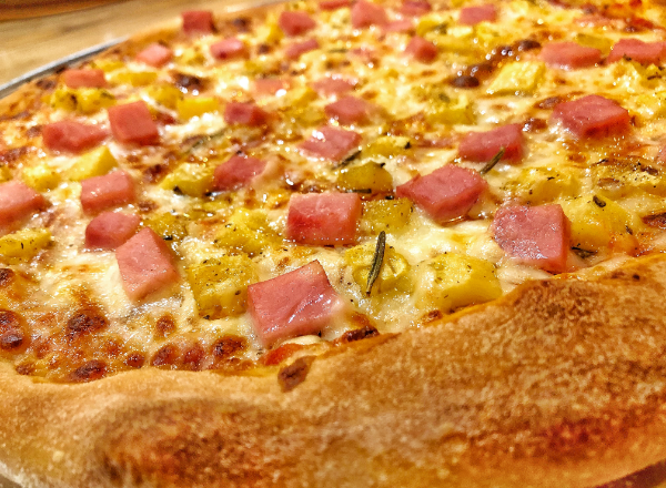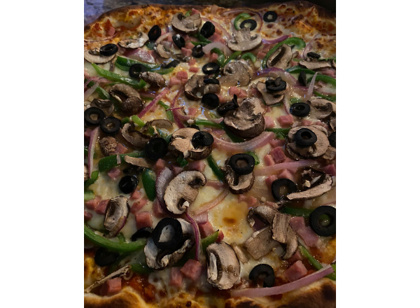 Jamon, champiñones, aceitunas negras, morron verde, cebolla morada