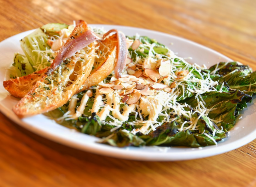 Base de lechuga orejona al grill, aderezo cesar de la casa y topping de almendras fileteadas y croutones de ajo