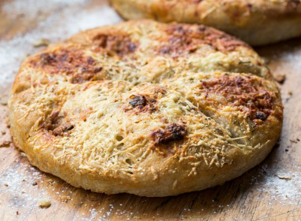 Masa esponjosa, ataviada con hierbas aromaticas, aceite de oliva y topping de parmesano