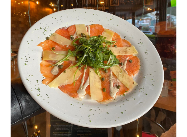 Laminas de salmon natural con aderezo de anchoas, topping de alcaparras y lajas de queso parmesano con ensalada de arugula