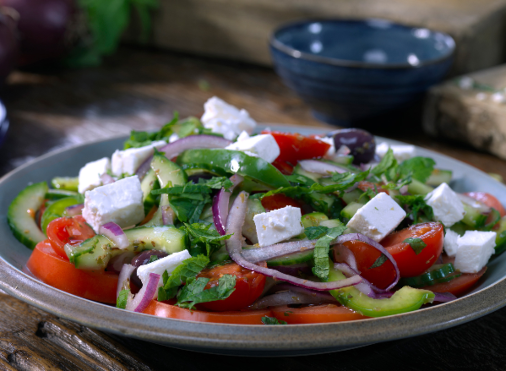 Mix de lechugas, tomates cherries, queso cambozola, aceitunas kalamatas, cebolla morada, pimentos rojo asado