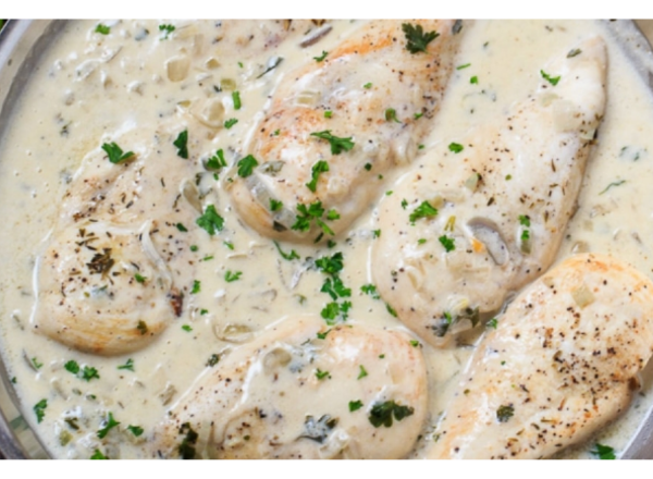 250gr de pechuga de pollo a la plancha bañada en salsa cremosa con tocino crujiente acompañada de esparragos cocidos
