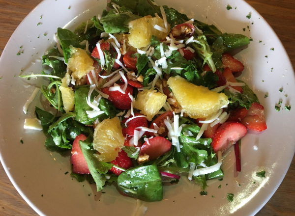 Mix de lechugas con gajos de naranjas, fresas, nuez y queso feta rallado con aderezo de vinagreta a la naranja