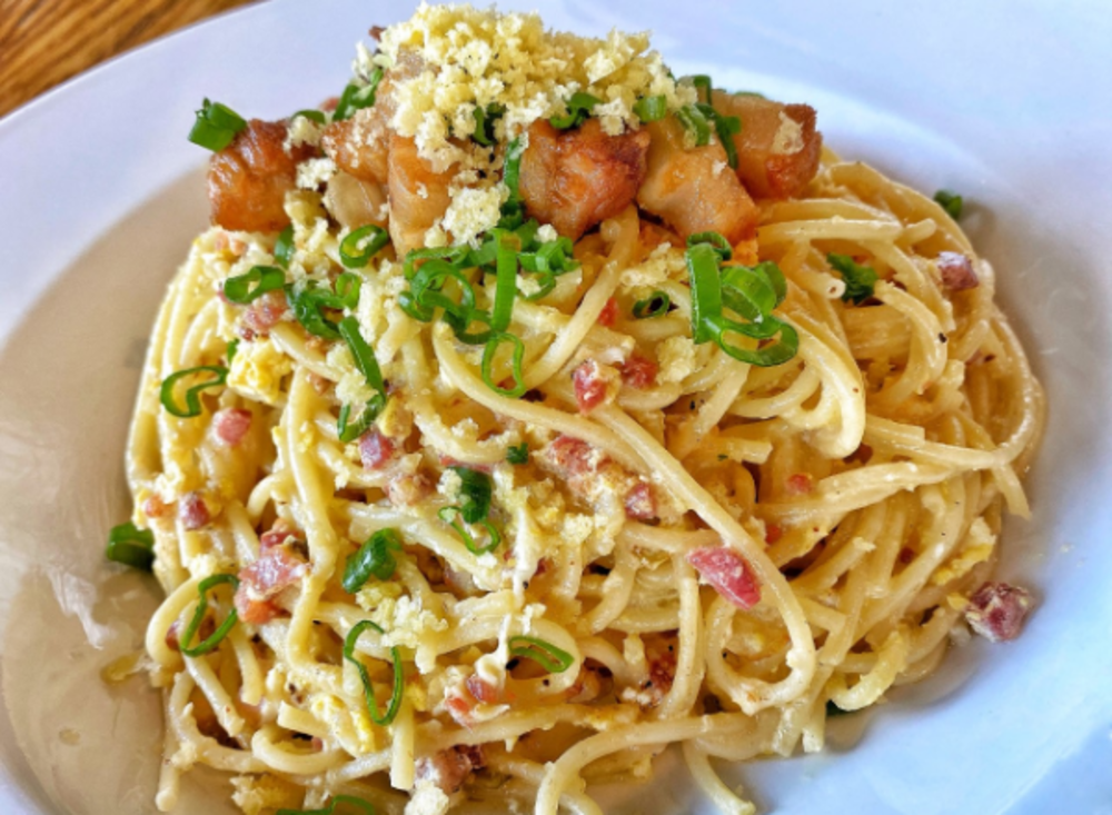 Aderezo a base de aceite de oliva, huevo y parmesano, con topping de tocino crujiente y cubos de jamon premium