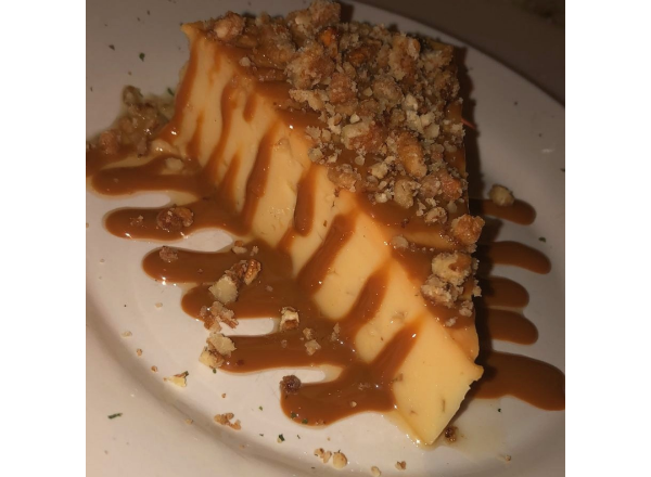 Porcion de flan napolitano bañado con cajeta y nueces caramelizadas