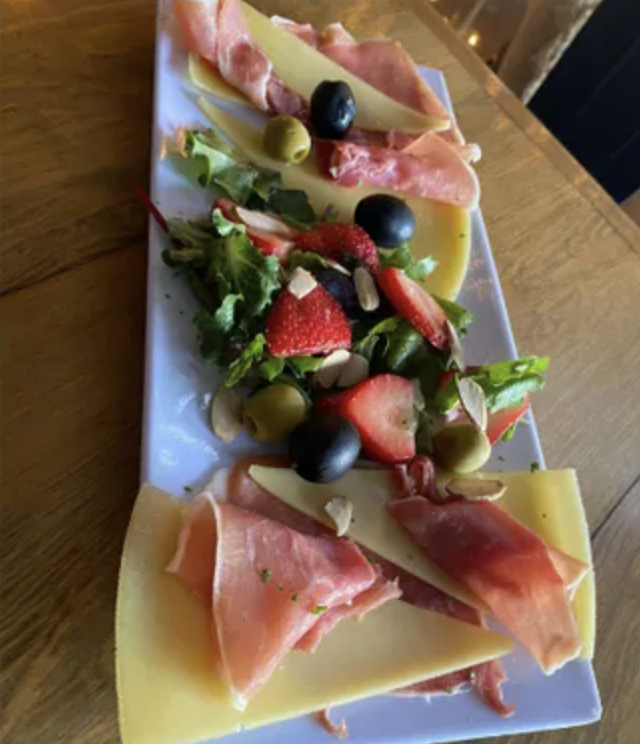 Prosciutto rebanado y lajas de queso parmesano frescos acompañado con ensalada, fresas y aceitunas