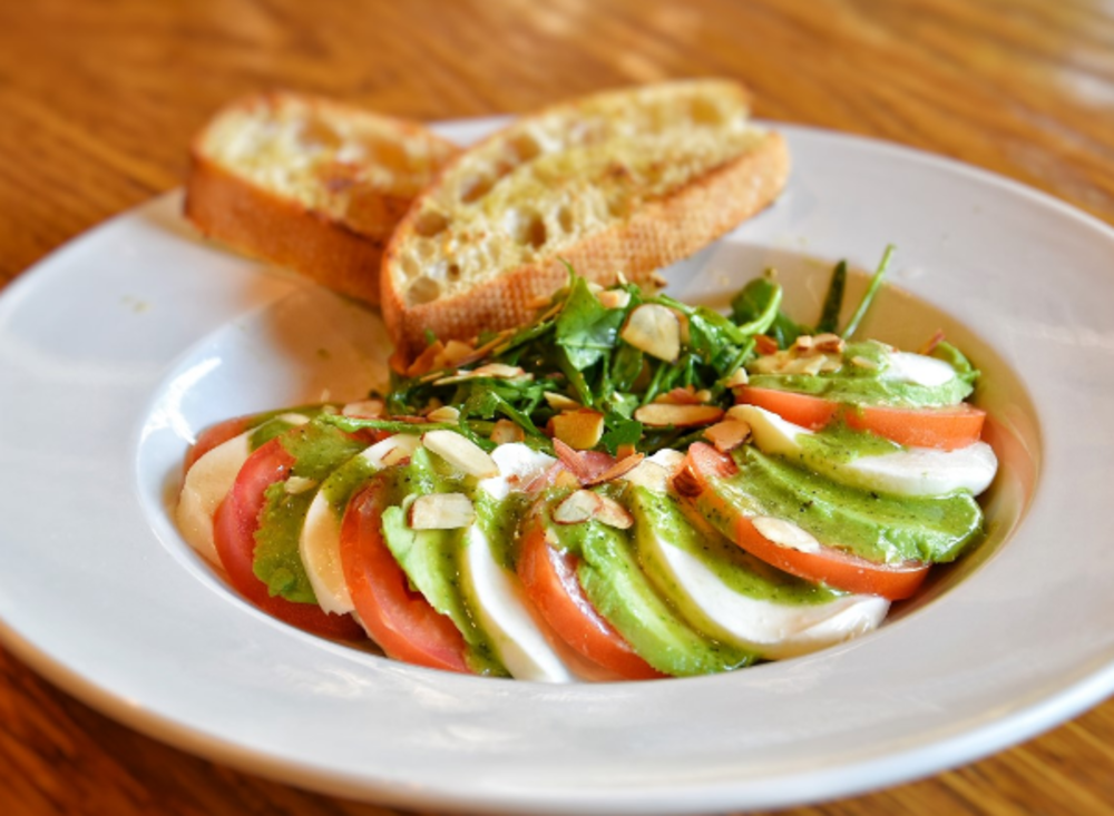 Rodajas de queso mozzarella, tomate, aguacate con baño de pesto con topping de almendras con ensalada de arugula.