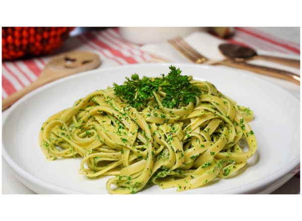 Pasta fetuccine en pesto ligero especial de la casa hecho a base de nueces