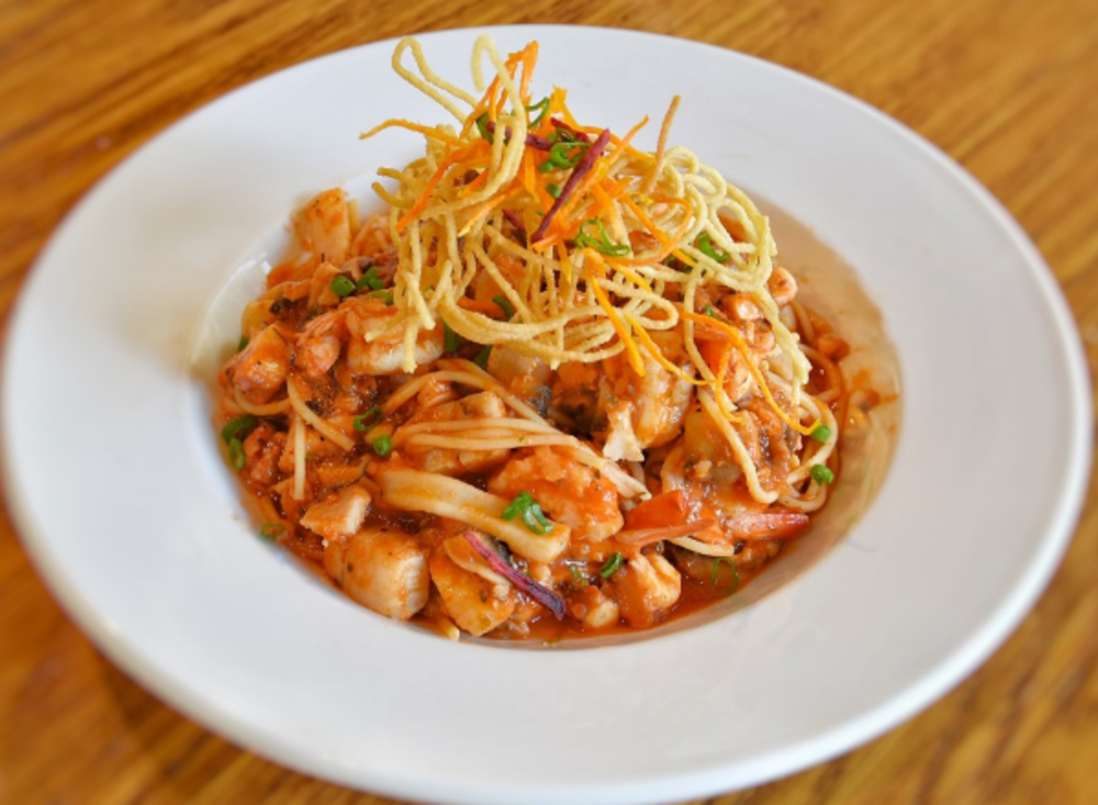 Spaghetti con los mas frescos frutos del mar: pulpo, salmon, camarón y calamar en salsa pomodoro de la casa