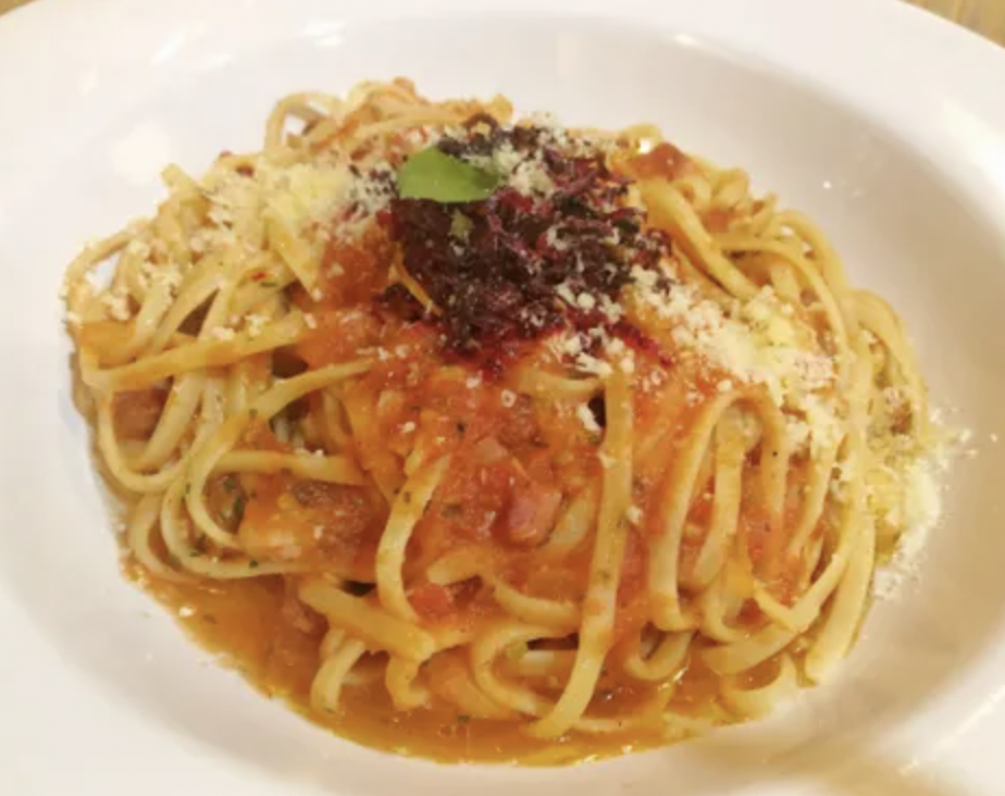 Deliciosa salsa base pomodoro de la casa con tocino crujiente y un toque de picante