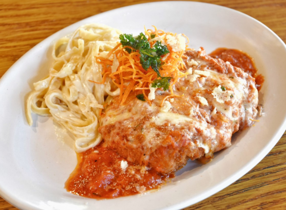 Pechuga de pollo empanizada, bañada en salsa pomodoro de la casa y parmesano acompañada de pasta fetuccine alfredo