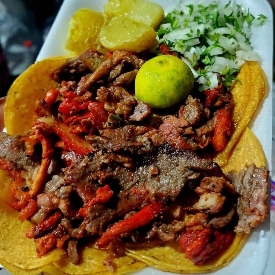 Orden mixta 6 tacos 🌮 3 trompo 3 bistec 🥩🍖🧅🌶️acompañado de salsa y cebolla asada 😋