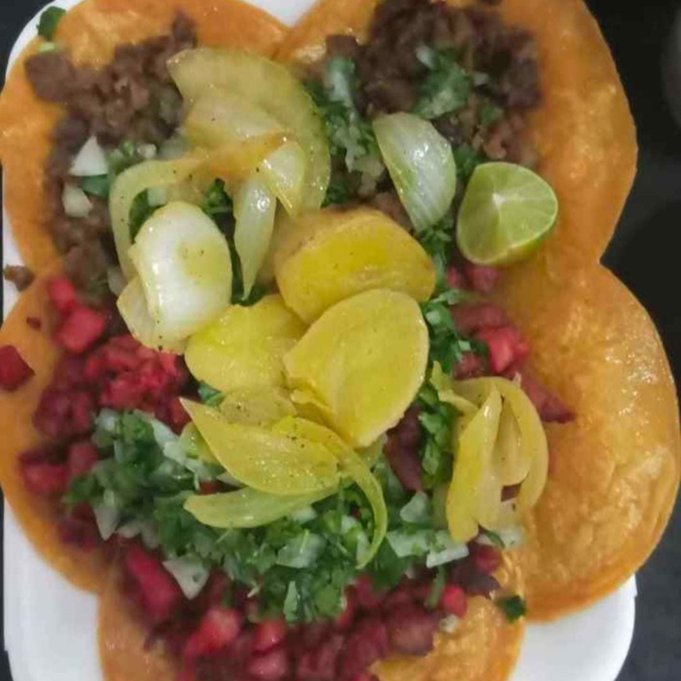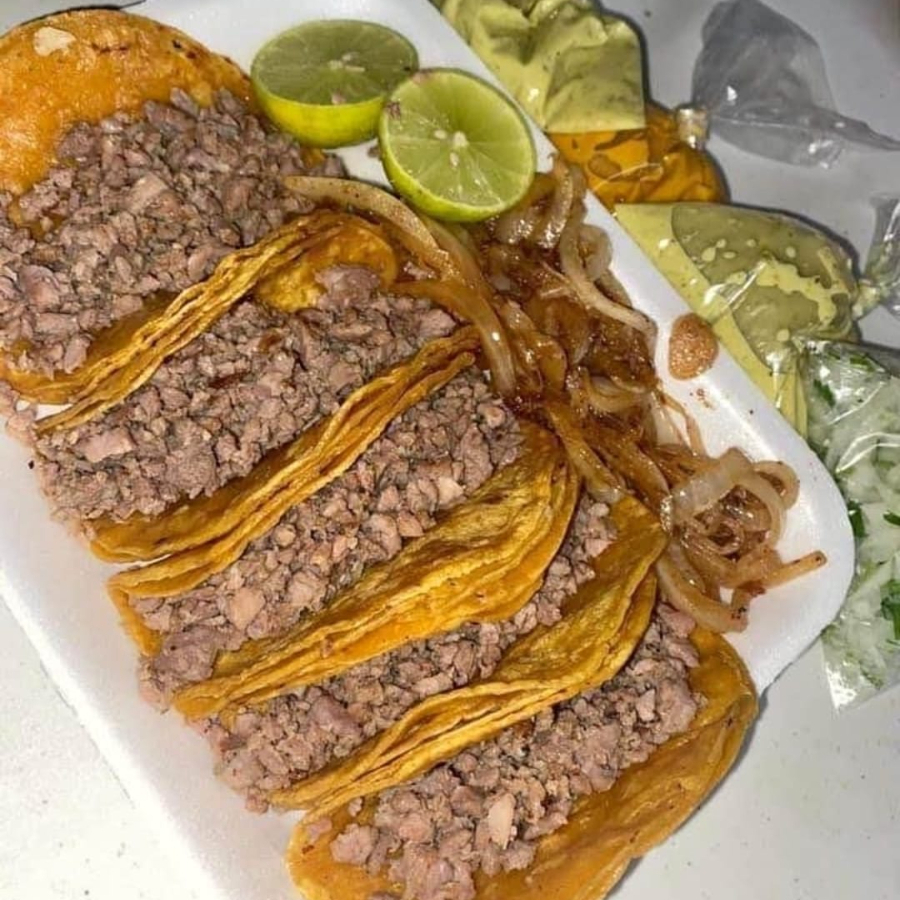 5 tacos de bistek 🌮🥩🍖 acompañados de salsa y cebolla asada