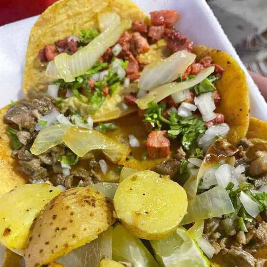 5 tacos de trompo 🥩🌮 acompañado de salsa y cebolla asada