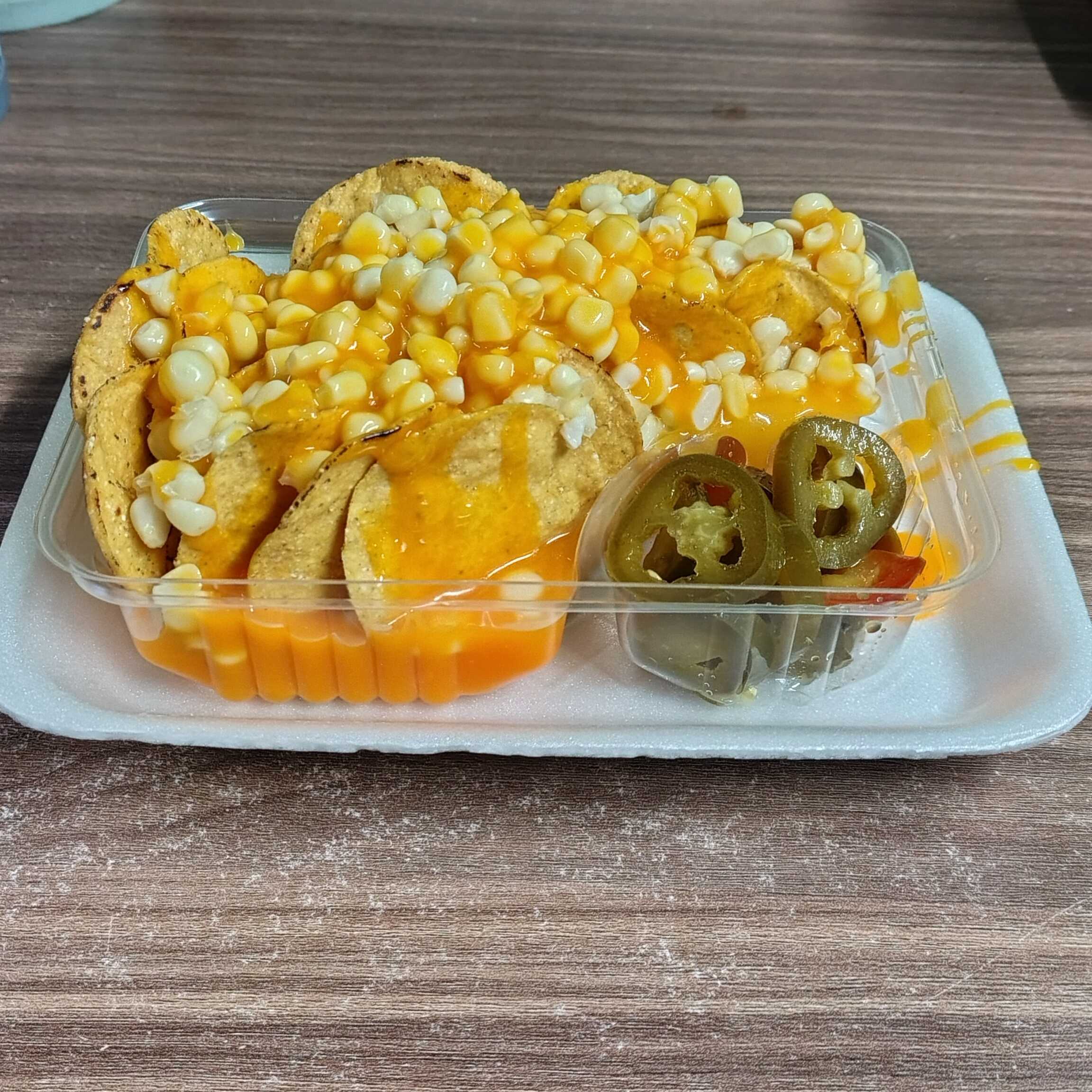 Charola de nachos con queso amarillo, elote y chiles en vinagre (los ingredientes se envían separados)