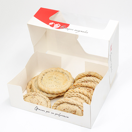 Caja con 16 piezas de reposteria 1 turco , 1 coyota, 3 gorditas tradicionales, 3 mini empanadas de cajeta, y 8 hojarascas.
