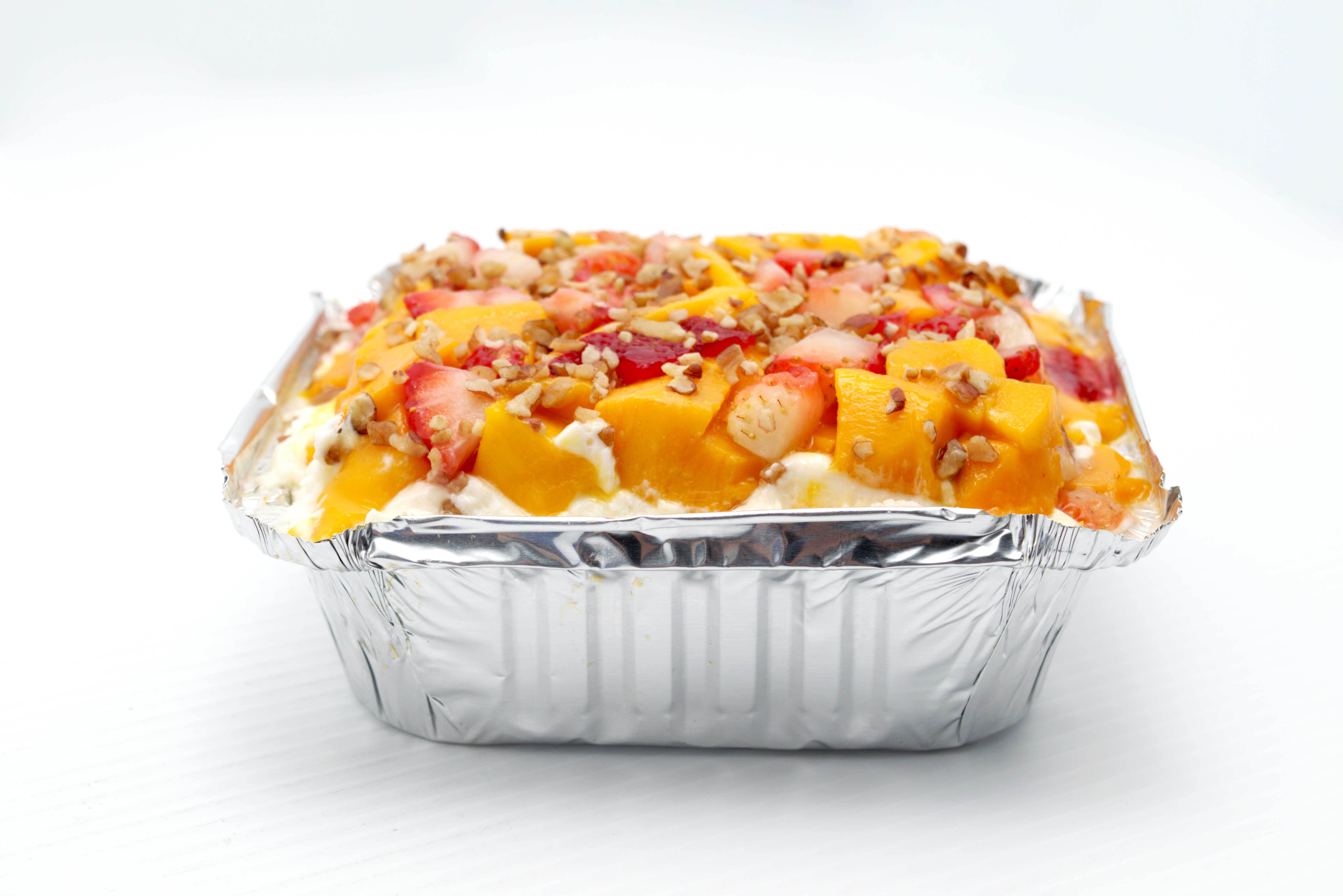 Postre de cake vainilla sumergido en jarabe de leche con cubierta de queso cremoso y trocitos de fresas y durazno