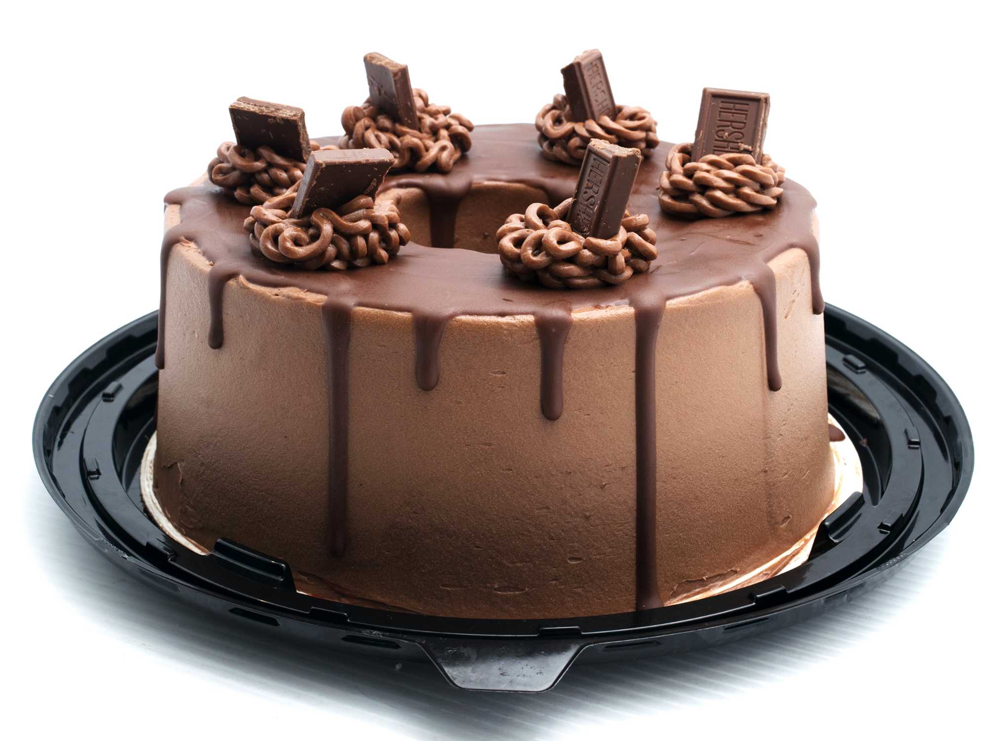 Mucho chocolate distribuido en una rosca de pan envuelta de chocolate cremoso, bañada con jarabe obscuro y adornada con herseys