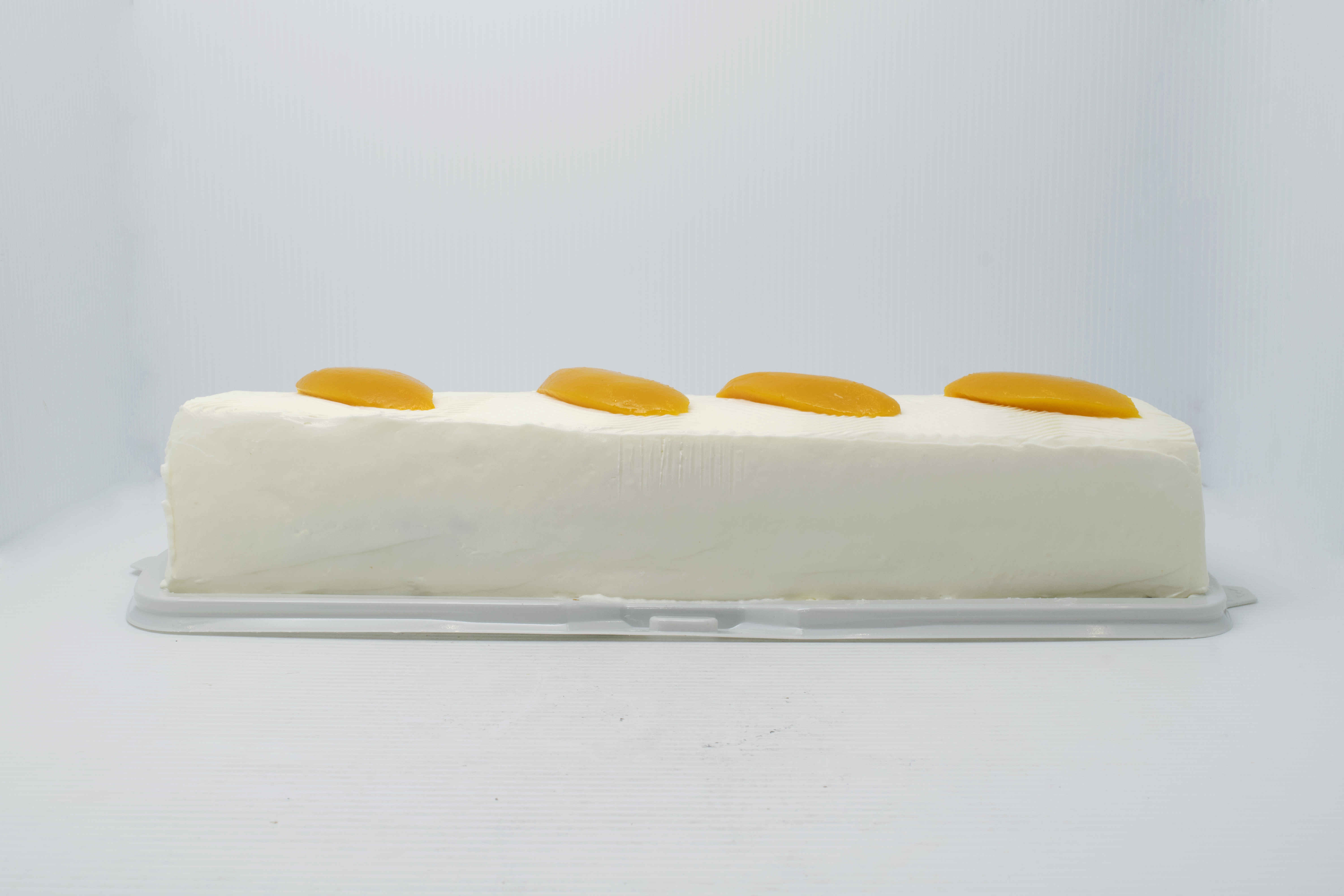 Pan de vainilla ligeramente húmedo enrollado entre trozos de mango y crema de queso