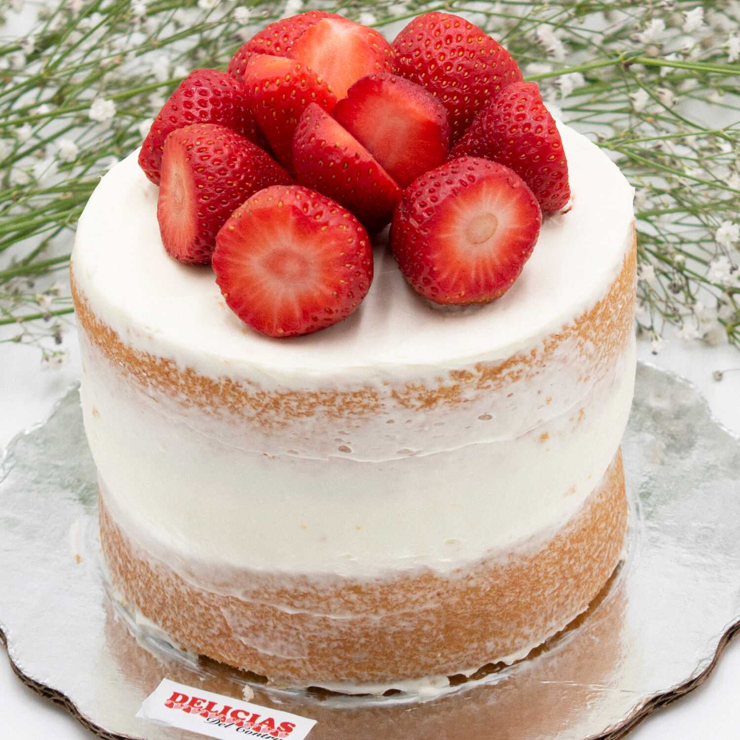 Pan de Vainilla ligeramente húmedo relleno de Fresas en cubos y crema de queso.