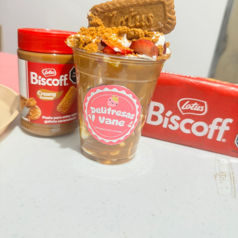 FRESAS LOTUS ACOMPAÑADAS DE UNTABLE LOTUS GALLETA TRITURADA EN LA PARTE DE ENMEDIO Y CORAMOS CON MAS GALLETA TRITURADA Y UNA ENTERA