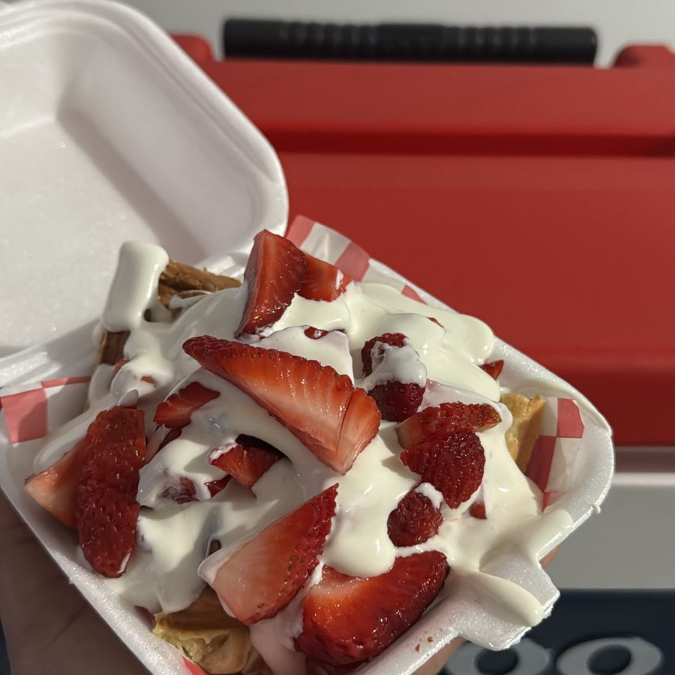 INCLUYE 1 WAFFLE FRESAS CON CREMA 2 TOPPINGS Y 1 JARABE
