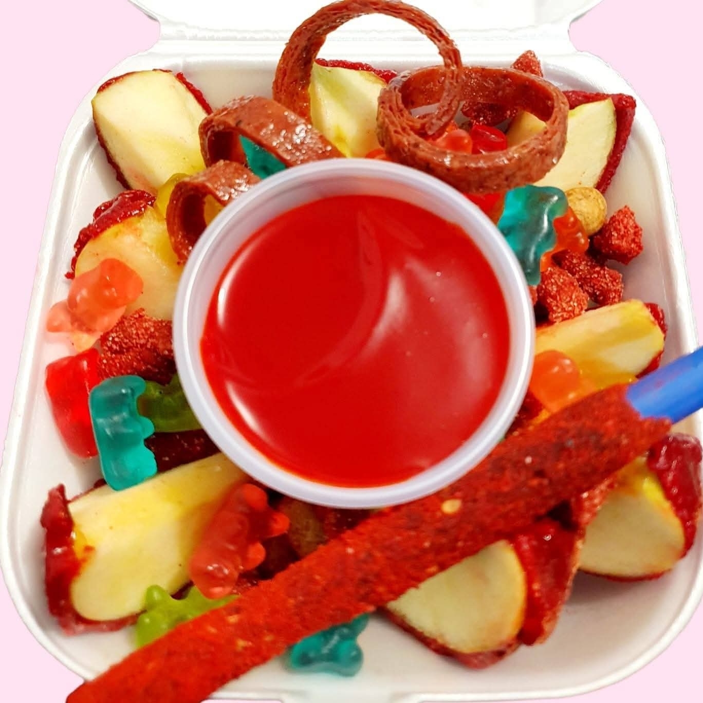 Manzana forrada con tamarindo, rellena de cacahuate japonés, golos, gomitas y bañada con salsa de chamoy.